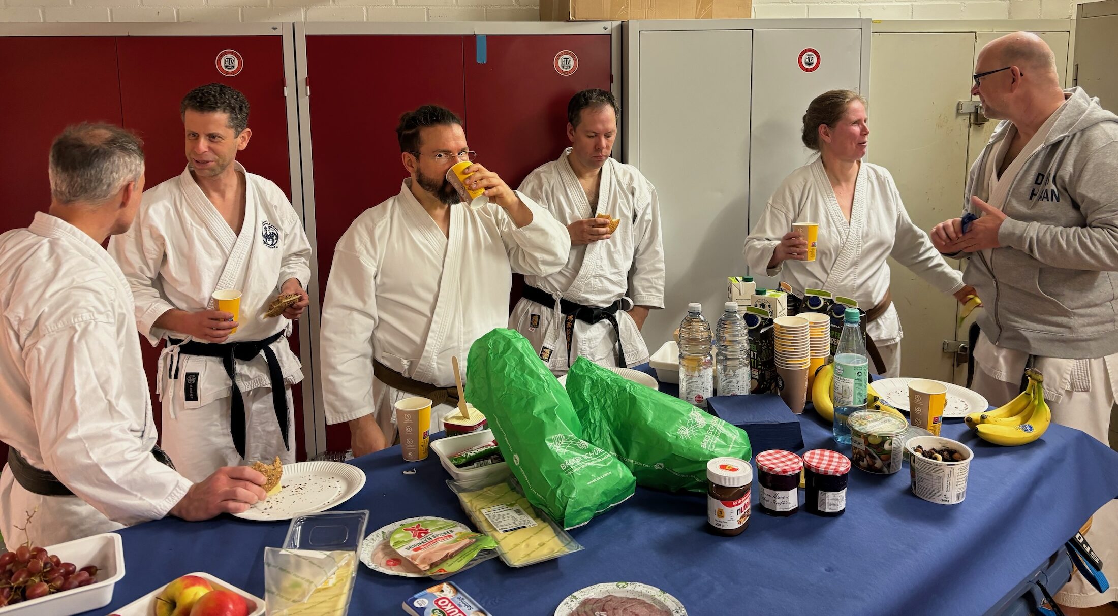 Tussen de training en de kyu test in was er een korte pauze waarin we genoten van de lekkere snacks, fruit en broodjes die de karataka’s van Haan hadden klaargezet. Als zij iets organiseren is het altijd tot in de puntjes geregeld, en dat was nu niet anders. Hongerig vielen we aan, terwijl bij de examen kandidaten de spanning langzaam op begon te lopen. Gelukkig hoefden ze niet lang te wachten.