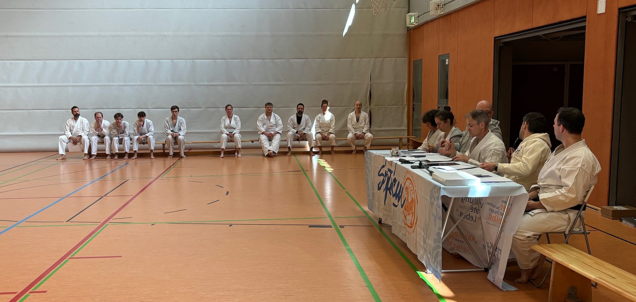 Tien mensen deden de kyu test, en lieten ondanks de zenuwen zien wat ze in huis hadden. Voor een aantal betekende dat dat ze er een graad bijkregen, en voor anderen de bevestiging dat de graad die ze hadden nog steeds klopte. Je krijgt sowieso waardevolle feedback en hebt weer eens onder druk moeten presteren, dus het is altijd goed om aan kyu tests mee te doen. In oktober, tijdens het seminar, is er weer een volgende gelegenheid.