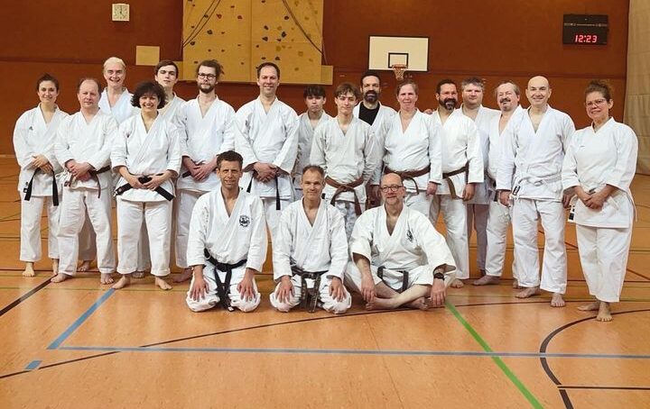 In de stromende regen reden we vanmorgen met zijn vijven naar Haan (Dld.), waar Shotokan Karate Haan hun jaarlijkse kyu test zou houden. Daar aangekomen kleedden we ons snel om, begroetten uitgebreid onze vrienden uit Haan en Enschede, en namen toen onze posities in bij de line up. Het was een mooie groep van zo’n twintig mensen: omdat deze kyu test altijd voorafgegaan wordt door een training, is het ook interessant voor mensen die helemaal geen examen gaan doen. Na een gezamenlijk kihon gedeelte splitste de groep zich dan ook op in tweeën. De examenkandidaten gingen verder met de voorbereiding van hun examenprogramma, en de blackbelts gingen aan de slag met jiyu ippon kumite en Jutte.