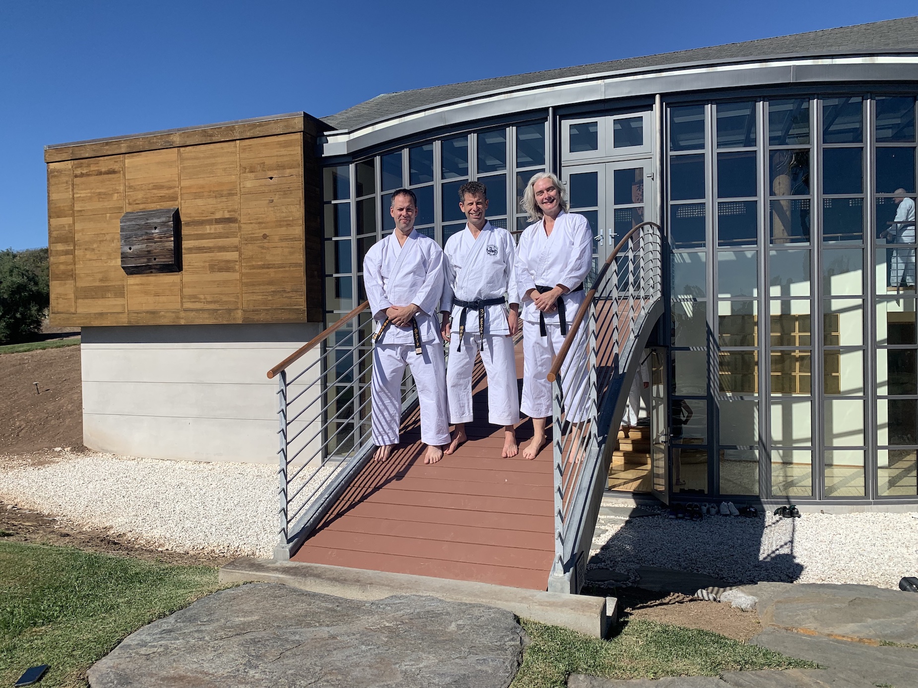 Wat een prachtige plek! Het terrein kijkt uit over de zee, en wordt duidelijk met veel liefde en aandacht onderhouden. De dojo zelf is een prachtige combinatie van klassiek en modern, in elke hoek valt iets moois te zien aan het ontwerp. We kregen de eerste training van Alex Guillen, die al aangaf dat het zomaar zou kunnen dat Ohshima Sensei nog even langs zou komen aan het eind. Aangezien een ontmoeting met Ohshima Sensei voor ons allemaal een heel belangrijk onderdeel van deze reis was, was dat meteen een nogal spannende mededeling.