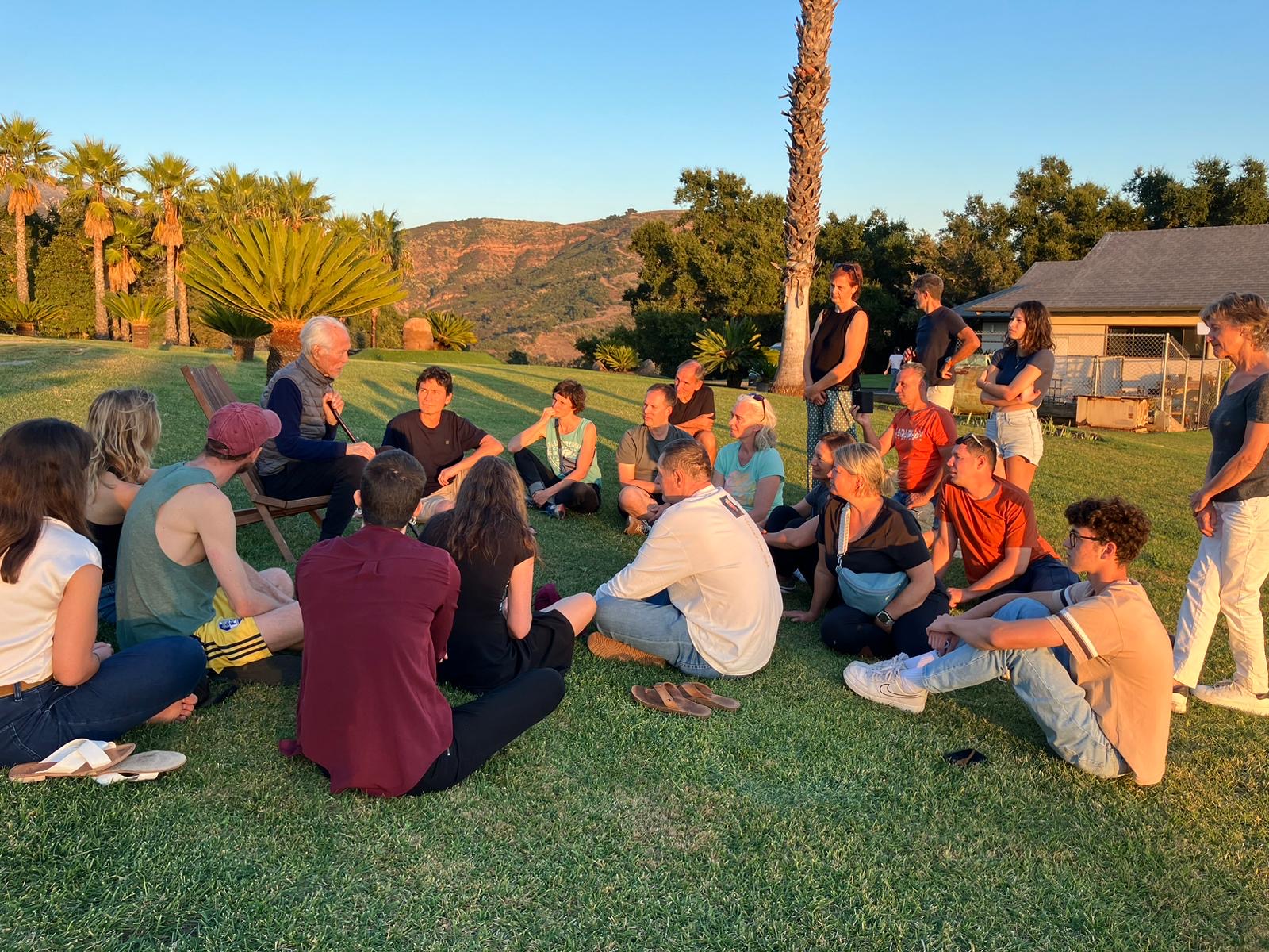 Op de derde trainingsdag werden de trainingen geleid door Norman Welch, de shihan van Canada Shotokan Karate. John Teramoto, de shihan van SKA kwam kijken, ook al zo’n beroemdheid voor ons, heel leuk om deze mensen te kunnen ontmoeten en aanwijzingen van ze te krijgen. Die avond werden we door Sensei getrakteerd op een diner in de residence naast het dojo terrein, waar ook nog een aantal andere mensen van SKA zouden komen, heel leuk. Alex raadde ons aan om in afwachting daarvan bij de dojo te blijven en de zonsondergang daar te bekijken. Terwijl het licht langzaam goudkleurig werd, kwam Sensei naar buiten en nam uitgebreid de tijd om met ons te praten. Uiteindelijk werd er een stoel voor hem in het gras gezet en gingen we in een kring om hem heen zitten om verder te praten. Het was super indrukwekkend om daar in die vredige setting naar hem te kijken en te luisteren, met als achtergrond die prachtige dojo en daarboven de knalblauwe lucht. We mochten alles vragen wat we wilden en hij gaf uitgebreid antwoord. Toen het tijd was om te gaan eten namen we afscheid en keken we elkaar ongelovig aan. Wat hadden we net meegemaakt? Alex verwoordde het uiteindelijk goed met:” It doesn’t get any better than this.” Het diner daarna was enorm gezellig en het was heel leuk om bijvoorbeeld van John nog meer te horen over de geschiedenis, principes en gedachten van Shotokan Karate of America, waar we allemaal deel van uitmaken.