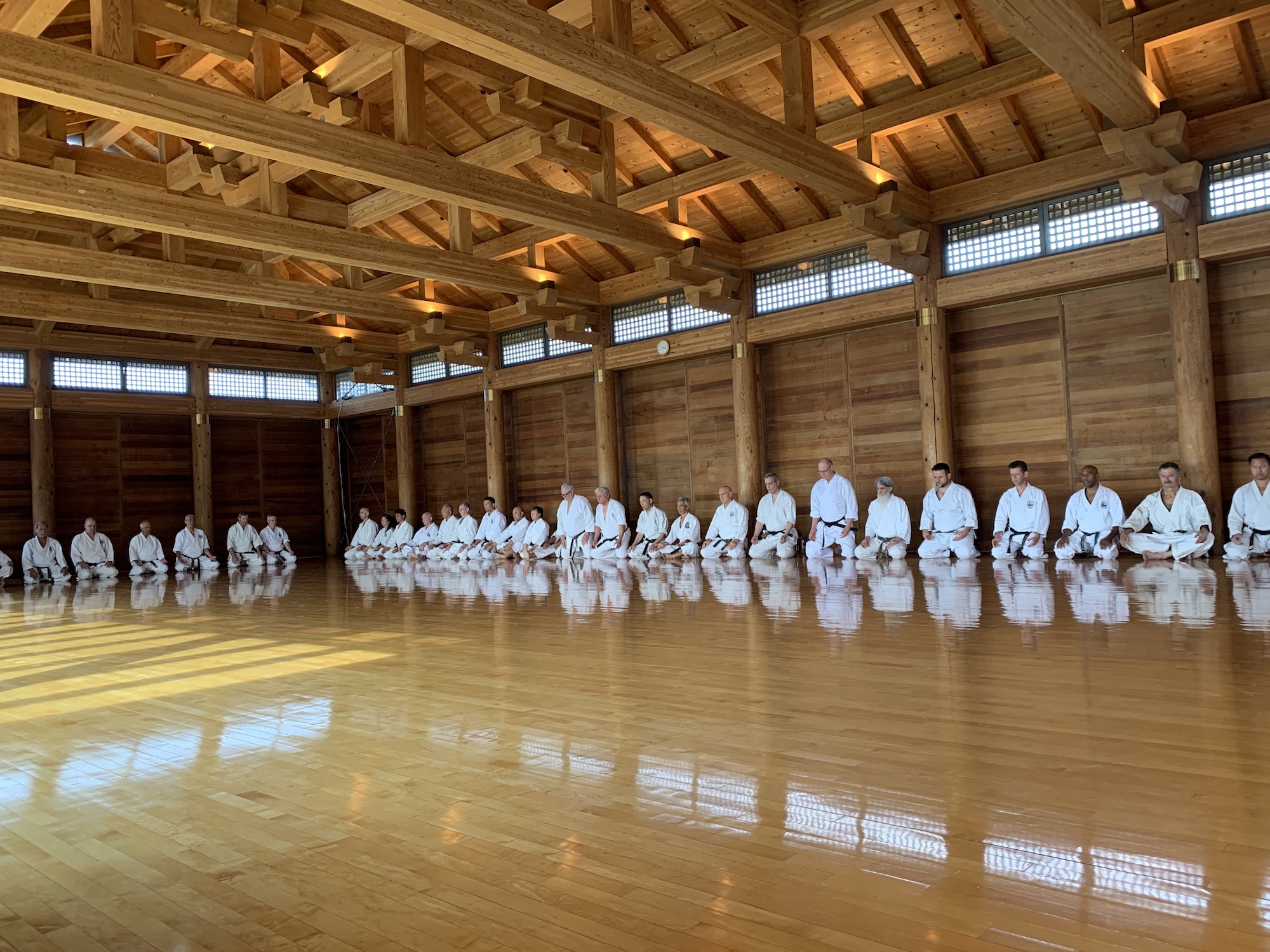 Tijdens ippon kumite voelden degenen die met hun rug naar de deur opgesteld stonden ineens dat er iets veranderde in de sfeer. Het werd stiller en de ogen van hun tegenstanders schoten steeds naar iets dat er achter hen gebeurde. Het was uiteraard duidelijk: Ohshima Sensei was binnengekomen. Het was indrukwekkend om hem in levende lijve te zien. Inmiddels op leeftijd, maar in zijn blik zag je nog steeds die immense kracht. Nadat hij ons een tijdje had zien trainen kregen gaf hij ons een aantal waardevolle inzichten mee en konden we kort nog wat dingen aan hem vragen. Toen het voor hem tijd was om te gaan, hadden we een lunchpauze waarin we deze ervaring even konden laten zakken. Voor de meesten was het de eerste keer dat ze in deze dojo trainden en Sensei ontmoetten, dus er was veel om over te praten met elkaar.