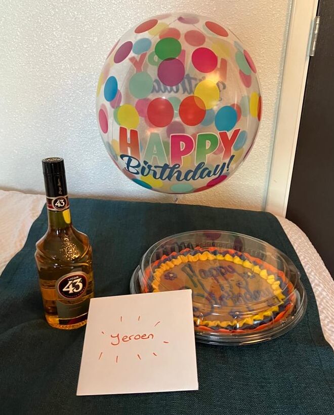 Daarna waren we toe aan de borrel, dit jaar gehouden in een van de slaapkamers. Gezellig, een soort schoolkampgevoel met een muziekje uit een telefoon en een berg lekkers in het midden. De karateka’s van dojo Haan (Dld.) hadden nog een speciaal gemaakte Duitse koek en feestelijke drank meegenomen, heel attent en super lekker!